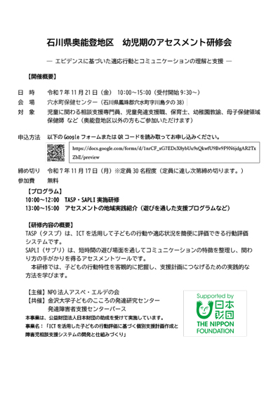 令和7年11月21日(金)石川県奥能登地区 幼児期のアセスメント研修会を開催します。