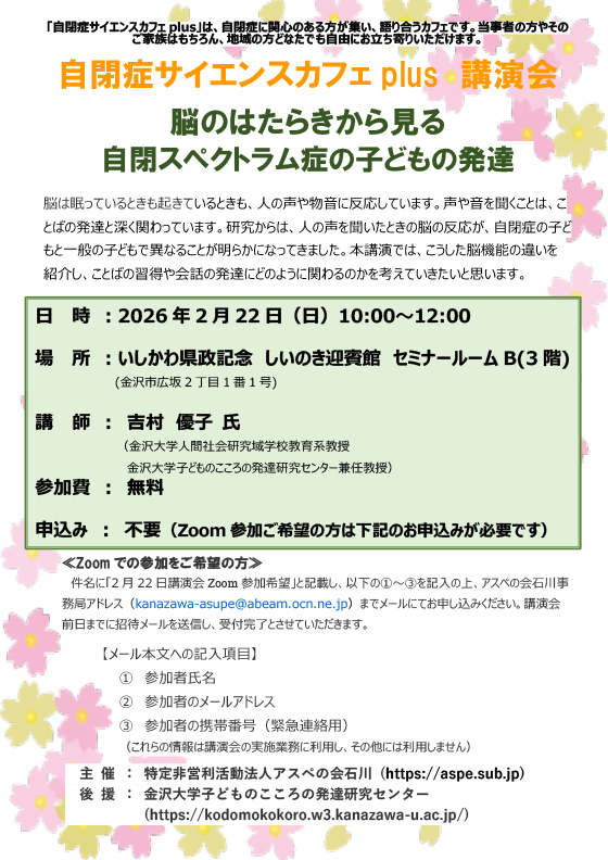 2026年2月22日(日)自閉症サイエンスカフェ plus 講演会にて、吉村優子兼任教授が「脳のはたらきから見る自閉スペクトラム症の子どもの発達」と題して講演いたします。